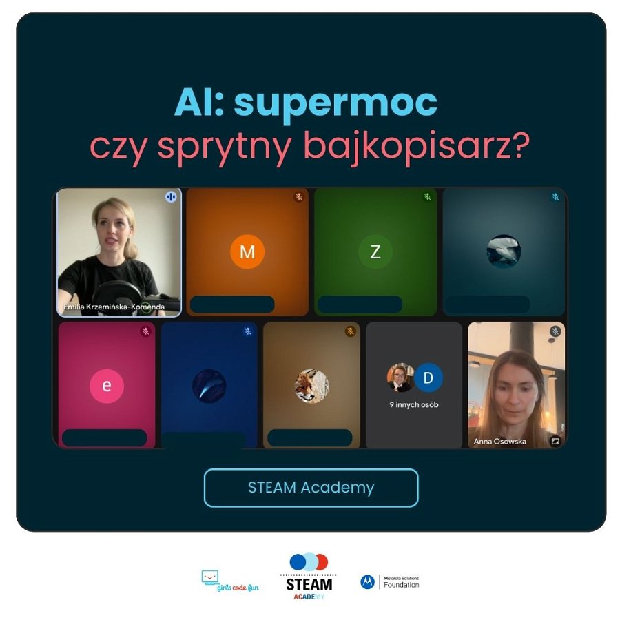 Właśnie z taką perspektywą uczestniczki #STEAMAcademy spędziły sobotę na warsztacie „AI: supermoc czy sprytny bajkopisarz?”, prowadzonym bez technicznego żargonu, za to w angażującej i praktycznej formule. Naszą przewodniczką była Emilia Krzemińska-Komenda, z którą wspólnie odkrywałyśmy zastosowania AI w codziennym życiu, testowałyśmy narzędzia takie jak Notebook LM oraz rozmawiałyśmy o tym, jak odróżniać wartościowe wsparcie technologii od treści, które mogą wprowadzać w błąd.